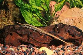 F. acus is one the most commonly exported species of Farlowella for the aquarium. Twig catfishes are peaceful and sociable bottom dwellers and can be kept in most freshwater community tanks without problems, either as a single pet or as a group. It thrives best in a tank of at least 24 inches (60 cm) or 35 gallons, and should be provided with plenty of shelter such as bogwood pieces, vine roots, vertical twigs or slender plant stems to allow natural behavior. However, twig catfishes do not handle sudden or large amounts of water changes very well. They easily succumb to the shock of such an action. Therefore, a few small water changes per week with aged water are recommended in order to avoid stress. The water pH should be neutral with the temperature maintained between 72–77°F. This fragile fish should be kept in a well-filtered aquarium with other quiet tankmates such as small characins (tetras), rasboras, or Corydoras catfish. Aggressive fish such as barbs, cichlids, and larger catfishes should be avoided.
