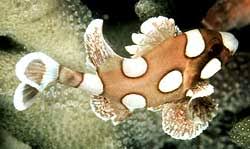 Plectorhynchus, the sweetlips, is a genus in the family Haemulidae, with 35 species found in fresh, brackish and salt waters. These fish have big, fleshy lips and tend to live on coral reefs in the Indo-Pacific in small groups or pairs. They will often associate with other fishes of similar species; several species of sweetlips sometimes swim together. They are usually seen in clusters in nooks and crannies or under overhangs. At nightfall, they venture from their shelters to seek out their bottom-dwelling invertebrate prey, such as bristleworms, shrimps and small crabs.Sweetlips' colouring and patterning changes throughout their lives. Adult ribboned sweetlips (Plectorhynchus polytaenia) develop increasing stripes with age. Juvenile sweetlips generally look quite different from the adults, and often live solitary lives on shallower reef sections than those where the adults are found. Juveniles may be banded or spotted and are usually a completely different colour from the adult. Small juveniles have a strange, undulating way of swimming, possibly mimicking poisonous flatworms as a means of camouflage.