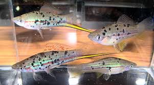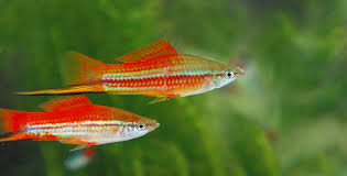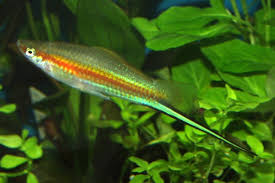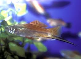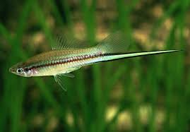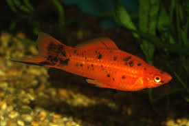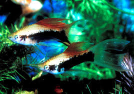 The green swordtail (Xiphophorus hellerii) is a species of freshwater fish in family Poeciliidae of order Cyprinodontiformes. A live-bearer, it is closely related to the southern platyfish or "platy" (X. maculatus) and can crossbreed with it. It is native to an area of North and Central America stretching from Veracruz, Mexico, to northwestern Honduras.The male green swordtail grows to a maximum overall length of 14 cm (5.5 in) and the female to 16 cm (6.3 in). The name "swordtail" is derived from the elongated lower lobe of the male's caudal fin (tailfin). Sexual dimorphism is moderate, with the female being larger than the male, but lacking the "sword". The wild form is olive green in color, with a red or brown lateral stripe and speckles on the dorsal and, sometimes, caudal fins. The male's "sword" is yellow, edged in black below. Captive breeding has produced many color varieties, including black, red, and many patterns thereof, for the aquarium hobby.The green swordtail prefers swift-flowing, heavily-vegetated rivers and streams, but is also found in warm springs and canals. Omnivorous, its diet includes both plants and small crustaceans, insects, and annelid worms.