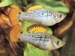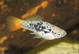 The variatus platy (Xiphophorus variatus), also known as variable platyfish or variegated platy, is a species of freshwater fish in family Poecilidae of order Cyprinodontiformes. A live-bearer, it is native to southern Tamaulipas and northern Veracruz states in northeastern Mexico. It is a popular fish in the aquarium trade due to its prolific breeding, as are hybrids with other members of its genus, most notably the southern platyfish.The variatus platy grows to a maximum overall length of 7.0 cm (2.8 in). In the wild, they are olive in colour with black marbling or spots on the side of the caudal peduncle. Large males show blackish blotches on the dorsal fin. Unlike some other members of the genus, X. variatus has no claw at the tip of the fifth anal fin ray. The fourth pectoral ray shows well-developed serrae (saw-like notches). They typically have 20 to 24 lateral scales, 10 to 12 dorsal rays and two rows of jaw teeth.
